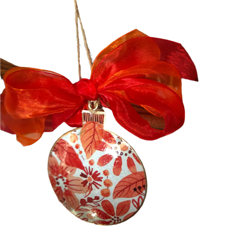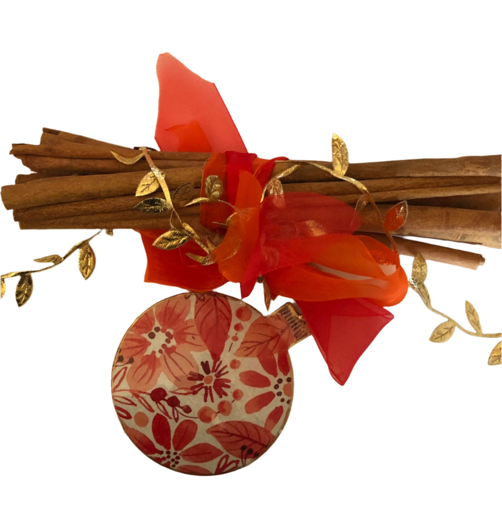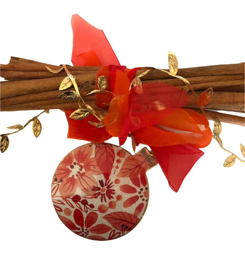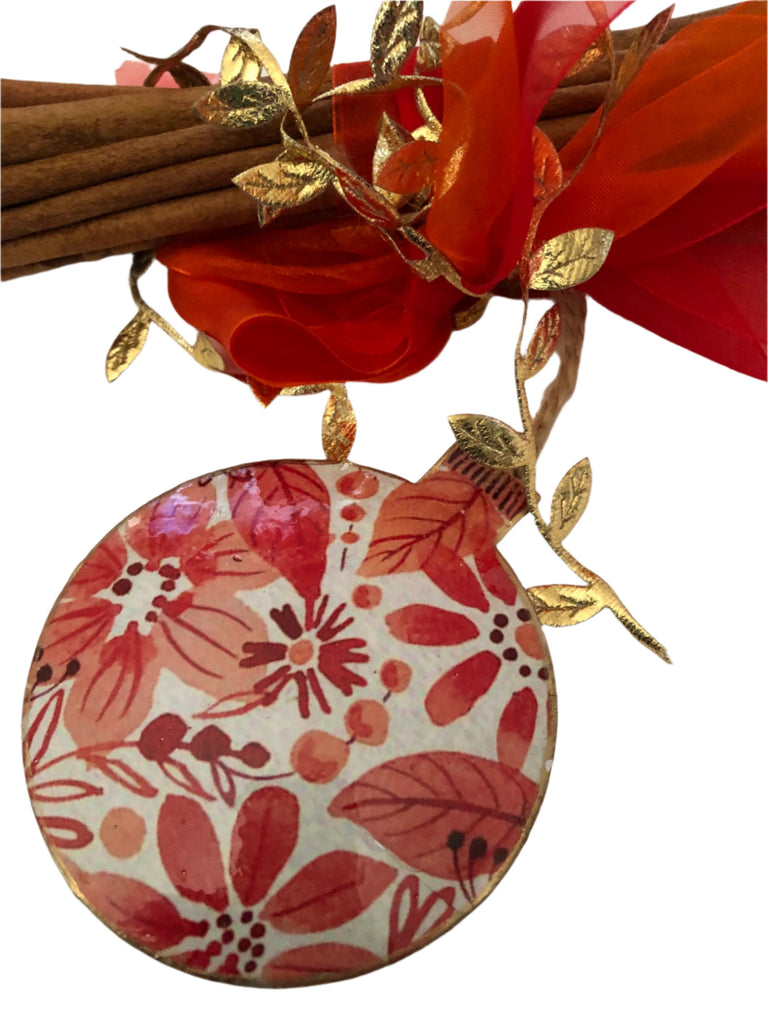 Vibrantly colourful metal disc bauble measure 10cm. Hangs with a short loop of twine. Other options: with sweet cinnamon bundle (80g, 15cm); with bundle and refresher essential oil 5ml.