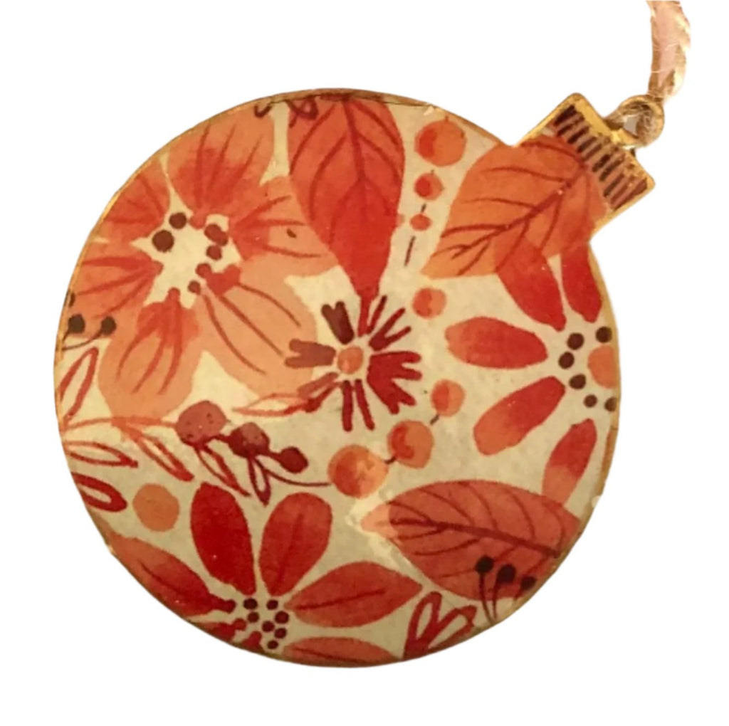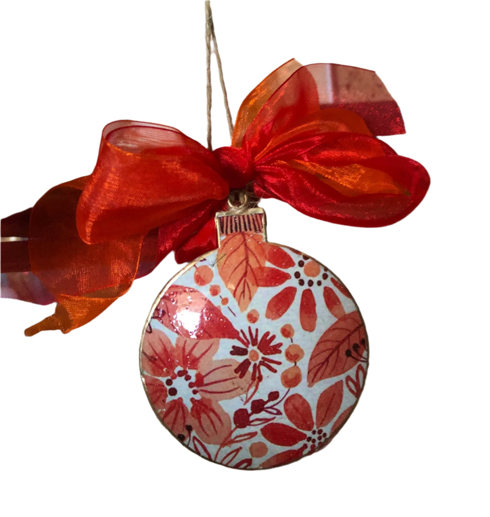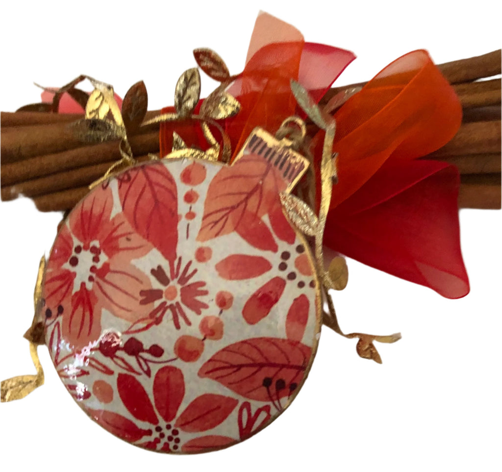 Vibrantly colourful metal disc bauble measure 10cm. Hangs with a short loop of twine. Other options: with sweet cinnamon bundle (80g, 15cm); with bundle and refresher essential oil 5ml.